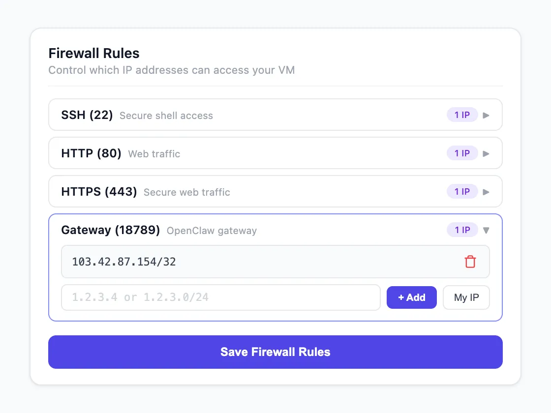 Configure inbound port rules from the Tropic dashboard. By default, no ports are exposed to the public internet — traffic goes through Tropic's reverse proxy.